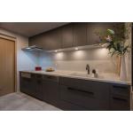 3mを超えるキッチンカウンターを、一枚天板で施工するため搬入経路を確認しながら、実際にその大きさの段ボールを使ってシミュレーションを実施。完成へ向けて一緒に丁寧に進めていきました。ハイグラーナホワイトのカウンターにグレーストーンの扉が組み合わさり、透明感と重厚感のバランスが美しいキッチンです。