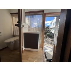 コンパクトでスペースをあまり取らないタンクレスタイプのトイレを奥側に、同じくコンパクトなサイズの洗面台を手前に設置しました。これでトイレの度に外に出なくてもよくなりました。