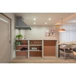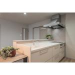 リビング全体を見渡せる対面キッチンへと生まれ変わりました。 キッチンはTOTO「ミッテ」を採用。収納力とお手入れしやすい素材・形状が特徴です。 LDK側の対面キッチン腰壁には“見せる収納”で、しまうだけでなくインテリアとしても楽しめるデザインとしています。
