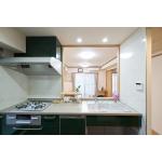 オープンスペースにゴミ箱を置くことで、限られたスペースを有効に使いながら、すっきりとしたキッチンを実現できます。 さらに、背面の壁を取り壊してキッチン空間自体を広げ、カップボードを設置しました。 色はご希望の緑に合わせて、「トクラス Bb」を採用。 暗さを解消するために、開口部を広く取り、照明もダウンライトに変更したことで、明るく快適な空間に生まれ変わりました。 入口の扉も開き戸から引き戸に交換し、使い勝手を向上させています。