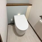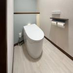 お客様のご要望にお応えし、2か所のトイレを新しい設備へ交換しました。今回はそのうちの一か所をご紹介します。既存の背面収納はそのまま活かし、収納側の壁と背板にはグレーのアクセントクロスを貼ることで、落ち着きのある上質な空間に仕上げました。その他の壁はシンプルな白系クロスとし、床にはやわらかな石目模様のクッションフロアを採用することで、明るく清潔感のある印象を演出しています。 設備にはTOTOの一体形便器ネオレストAS1を採用。トルネイド洗浄やセフィオンテクトによる汚れの付きにくさ、フチなし形状やお掃除リフトなど、お手入れのしやすさにも優れています。さらに、ノイズレスデザインの手洗器を備えたレストルームドレッサーコンフォートシリーズや棚付き2連紙巻器を組み合わせ、機能性とデザイン性を両立した快適なトイレ空間をご提案しました。