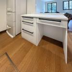 白を基調とした作業台に一新し、キッチンと統一感のある明るい空間に。カウンター下には引き出し収納を設け、使いやすさにも配慮しています。足元にゆとりを持たせた設計で、作業や家電の配置もしやすいすっきりとしたスペースになりました。