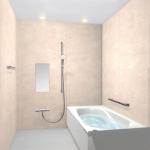 お客様が毎日気持ちよく使える浴室にしたいというご要望にお応えし、浴室全体をすっきりとしたデザインへ一新するプランをご提案しました。これまで設けられていた明り取り窓やジャグジー、カウンター・棚収納を見直し、空間をシンプルに整えることで、お掃除のしやすさと落ち着きのある上質な浴室へと生まれ変わっています。設備にはLIXILのシステムバス「リデア Cタイプ」を採用し、やわらかな石目調が上品なマニグレージュの壁パネルが空間に温かみを演出。床には汚れが付きにくくお手入れしやすいキレイサーモフロアを採用し、断熱性の高いサーモバスS浴槽とあわせて快適な入浴時間を実現しました。さらにエコアクアシャワーや握りバー、ランドリーパイプも備え、機能性と使いやすさを兼ね備えた浴室空間をご提案しています。