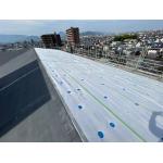既存屋根材を念のため補修した後に塩ビシート防水を上貼りしてあります。