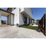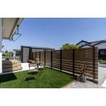 全体をブラウンでまとめ、可愛らしいお家の雰囲気に寄り添うナチュラル外構が完成しました。中古住宅での新生活に合わせて外回りを整えたいとのご相談から、既存コンクリート横に駐車場を新設し、横にはレンガ花壇で華やかさをプラス。奥にはインターロッキングを馬目地で敷いたアプローチを設け、玄関までの動線もやさしい印象に。横のお庭には人工芝が広がり、リビング前には出幅1.2mのデッキを設置。火を使うBBQのためにデッキ下は広めにコンクリート舗装とし、使い勝手と安全性を両立しています。お庭のフェンスも、デッキに腰掛けた際に視線が気にならない高さに整え、ほどよい囲われ感の落ち着く空間となりました。