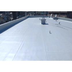 経年による劣化で防水シートが破れ雨漏りしていたので、下地コンクリート補修をした後に絶縁工法にて、塩ビシート防水の施工をご提案しました。