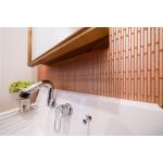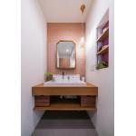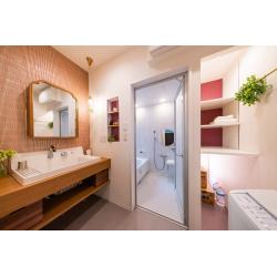 凹凸が多く狭さを感じた洗面室は、浴室をサイズダウンしてPS配管を整理し空間を確保。生まれた余白には下部に防災備品をまとめて置ける収納、上部にタオルや衣類の可動棚を設けました。さらに入口をずらして壁埋込ドアを採用し、洗面台を壁いっぱいに納め、背面にはガラスタイルを貼って洗練された印象に。機能性とデザイン性に加え、安心をそっと忍ばせたスタイリッシュな洗面室へと生まれ変わりました。