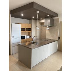 既存の対面キッチンを活かしながら、より開放感のあるシステムキッチンへリフォーム。 PanasonicのLクラスキッチンを採用し、デザイン性と機能性を両立。 下がり天井と照明で空間にアクセントをプラスしました。 奥には間仕切り収納棚を取付し、大切なお写真などを飾れるように。 空間全体と調和するカラーや素材で、すっきりとした上質なLDKに仕上げています。