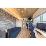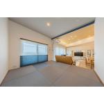 【リビング】 勾配天井を活かし、天井高をアップ。間接照明をバランス良く配置し、スマートフォンで調光調色ができるよう設定。天気や時間帯に合わせて、ご自分の好きなお部屋の明るさへ簡単に調節できるようにしました。 【浴室】 浴槽を1418mmから1616mmへサイズアップに成功。広々とした浴槽になり、よりリラックスしていただける空間となりました。 【書斎】 天井を照らすコーブ照明をご提案。やわらかい光にすることで、落ち着いた雰囲気の書斎が完成しました。 【収納】 リビング横を小上がりの和室へ。『畳が丘』を設置することで、畳の下にたっぷりと収納ができるようにしました。