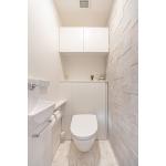 ・既存の便器は再利用し、ウォシュレットのみをTOTOの『アプリコット』へ交換しました。 ・床(既存利用)はTOTOの『ハイドロセラ・トイレフロアJ』。抗菌・抗ウィルス効果に加え、防臭効果があり、足元から清潔に。 ・正面右壁面には、玄関と同様にLIXILの『エコカラット』を。調湿機能、脱臭・空気清浄効果で、清潔なトイレ空間へ。