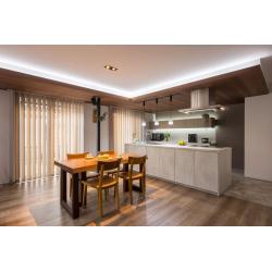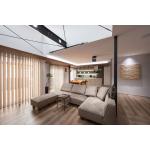 ルーバー・木製ブラインド・可動棚のある素敵なリビング