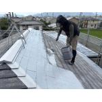 屋根はスレート屋根で、塗膜が劣化すると防水性が失われやすく、ひび割れや反りといった症状が出やすい屋根材です。今回も塗膜の劣化により屋根材の吸水が進んだことで、重度のコケやカビの付着が見られました。