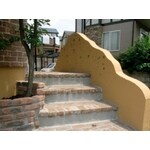 もともと駐車場横に玄関があったのを壁にして、リビングを玄関に移動。 外観で一番気を使ったのは以前の壁画、レンガ、タイルと、増築した部分との一体感でした。レンガ、タイルは以前のものと同じものが無かったため、部材選択には苦労しましたが、結果的に既存部と見分けがつかないくらいの仕上がりになりました。階段のステップのレンガ、花壇のレンガも種類を変えながら統一感を出し、塀の形も優しい波型に、色も外観にあわせ、からし色のジョリパット仕上げに。