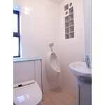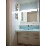トイレと洗面化粧台・洗濯機の配置が悪く、使いづらく片付かないことからリフォームを希望されました。リフォームするなら4人のご家族のうち3名が男性なので、節水やお手入れの面からも小便器を取付けて欲しいということに。収納スペースを確保するため配置にはかなり苦労しました。テーマカラーを淡いブルーに、奥様たってのご希望でガラスブロックを採用したので、壁面の仕上げは質感を合わせてタイル貼りでご提案しました。収納の扉と合わせて洗濯機スペースにもすりガラス入りの折れ戸をつけ、使用しない時はスッキリ収納しておくことが出来ます。清潔感のある空間に仕上がり、お客様にも大変喜んでいただきました。