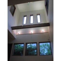 内外装とも傷みがひどかった為、構造体のみを活かした全改装に踏み切りました。イメージは「光と風が通り抜ける家」。以前は1階が非常に暗かった為、2階南側を吹抜けとし、太陽光が落ちる様に配慮しました。