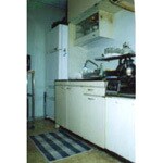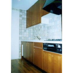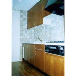 冷蔵庫の位置を変えキッチンを長くしました。キッチンの扉材は桜でタイルは素焼き風の厚手のものを貼りました。床材は水に強く美しさ、耐久性に優れたチークのムクのフロア-を選びました。細かいことですが照明の色を考え手元灯は蛍光灯でなく小さな白熱灯を二つ吊戸棚に埋め込みました。