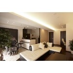 一般的なLDKのマンションの間取りを変え、新しくセカンドハウスとして生まれ変わらせました。間接照明を駆使した多灯使いで、遊び心の中にも大人の落ち着きを感じられる空間に。スッと1本、天井に光の筋が通ったようなシームレスな間接照明がワイドなLDKをより広々とみせる効果的な装置になっています。