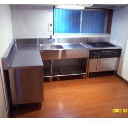 シンプルで頑丈な業務用キッチンでリフォームしました。やはりプロ仕様のキッチンは使いやすく機能美を感じます。 床は完全耐水でワックス不要のフローリングです。温かみのある色なのでステンレスの冷たい感じを打ち消していると思いますがいかがでしょうか。