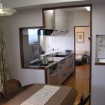 間仕切壁を開口したり、一部分ガラスをはめ込むなどして明るさと広がりのあるキッチンスペースになりました。 システムキッチンはTOYOキッチンBAYシリーズでカウンタートップは特注にて間取りに合わせて製作されたものです。