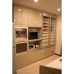 電子レンジや炊飯器などがスッキリ納まる棚や、収納力十分の食器棚をキッチンとお揃いで入れました。