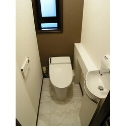 背中に手洗い器がある従来のタイプから、入口付近に手洗いカウンターが設置できるサティス給排水統合タイプに交換。ほのかなライトが付く自動水栓タイプですので夜間時の使用でも目が覚めにくい気配りのあるトイレでございます。また、床は大理石調のタイルを貼りましたので白を基調としたモダンな空間に仕上がりました。