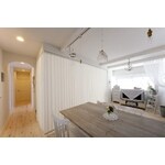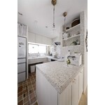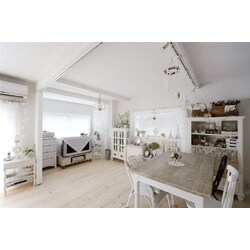 フレンチスタイルが好きな奥様のご希望は、可愛いけれど甘くなり過ぎないインテリア。お子様の成長に伴い、手狭になってきた子供部屋を広く取りたい、ベランダに出ている洗濯機を室内に入れたい、という二つのご要望をメインに大幅な間取りの変更をすることになり、家のイメージをフレンチスタイルに統一。キッチンは、家電・食器収納を兼ねたワークカウンターをポイントに、天然石タイルをふんだんに使い、エレガントに仕上げた。 リビングのポイントには、エイジング加工したこだわりの白い梁を付けた。ご夫婦の主寝室はリビングの一部にあり、バーチカルブラインドでゆるやかに仕切ることを提案。日中は、すべてがつながるため、リビングを広々使うことができ、またお子様が独立した場合の間取りの変更も楽にできるように配慮。