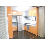 (旧日神住宅サポート株式会社での事例です。)築26年のマンションをスケルトンリフォームしました。 間取り変更可能な間仕切り開閉扉を設置し、バリアフリー対応で、キッチン・お風呂・トイレも設備はもちろん見えない配管までリニューアル。 ラッキーカラーがオレンジということから、鏡面のオレンジを選定し、明るくポップな印象となりました。