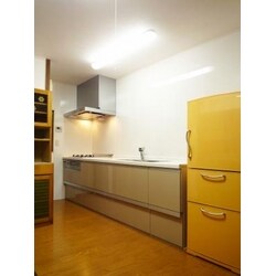 - 吊り戸をなくしたベージュのシンプルキッチン