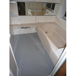 工事前のシステムバスは洗い場の床が傷んで変色しており、水はけも悪くお掃除が大変でしたが、新しいシステムバスでは翌朝には床がすっきり乾く「カラリ床」で清掃性が向上し、奥様のお掃除に関するお悩みも解決されました。また、爽やかな壁・浴槽の色と、横長の大きな鏡を取り付けたことで、とても明るいバスルームへと一新されました。