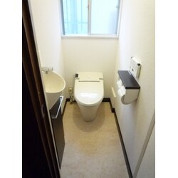 和式のトイレは足腰に負担がかかり、リフォームしたいとお考えだったH様。古いトイレよりも少ないお水で流せる最近の節水トイレにも興味があり、よく遊びに来るお孫さんも「おばあちゃんの家のトイレは古くて大変」と言われていたこともあって、タンクレスのトイレにリフォームしました。手洗い器やペーパーホルダーを濃いブラウンにしてモダンな印象のトイレになりました。