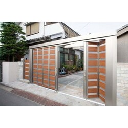 今回選択したガレージのゲートが洋風で奥にある和風のお庭や住宅と違和感が出ないように石の色を選択しました。縦列のカーポートに2台の車がゆったり納まります。ゲートの扉はアルミ製ですが、一瞬木製と錯覚するような綺麗な色です。