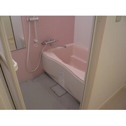 ユニットバスと洗面化粧台の交換、洗面脱衣室内の天井他の塗装、壁クロス貼り替え、床クッションフロアの貼り替えをしました。 温かなピンク色が多く使われた浴室になりました。