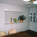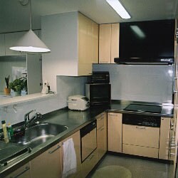 L型キッチンとIHヒーター、集合住宅で梁があるため収納ユニットをいかに工夫するか、既製品は不可能なので当社木工場で別注にて作成し、ぴったりとフィットしました。