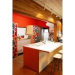 お料理が好きな奥様は、必要なときにお鍋やボウルがサッと取り出せるようにキッチンの収納はオープンスタイルをご希望され、どこに何があるか一目瞭然で厨房のようなキッチンになりまた。 また、1日のほとんどはキッチンにいるから元気をもらえる色にしたい!と壁を鮮やかなオレンジに。奥様がひとめぼれしたIKEAの布が、半オープン型キッチンの素敵なアクセントになっています。