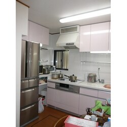 台所:冷蔵庫をあえてI型に配列、壁側に家電スペースとしてカウンターを設置、反対側にTV台を兼ねた、引出収納を設け一体にし収納も増やしました。 浴室:設置条件的に浴室を広げる事は難しく、サイズは1216のままでしたがTOTOサザナのどっぷり浴槽を採用する事で、今までの在来浴槽から比べてだいぶたっぷりと入れご希望に近づける事が出来ました。 キッチンも浴槽もピンクで統一、温かみが有る明るくなりました。