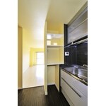 垂れ壁のクロスとキッチンのコントラストが目を引きます。