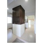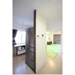 築37年のマンションのスケルトンリフォーム。「子供に明るく快適な家で育ってほしい」と、室内の仕切りをなくそうと考えました。しかし「生活感が丸出しになるのは困る・・・」そこでご提案したのが、L字型の小さな壁。ダイニングに設置した壁は上部をルーバーにし、玄関を入った時に見えるリビング・キッチンと冷蔵庫が視界に入り、雑然とした印象にならないようにしました。冷蔵庫も2つの側面をL型の壁で覆い、リビングからは見えなくなるようにしました。壁は、冷蔵庫の裏側を隠しつつインターホンやスイッチなどのスペースにもなっています。和室をフローリングにして洋間にし、壁面収納を設けて、収納スペースを確保しました。お施主様ご夫妻がお若かったので、今後の家族構成の変化なども想定し、ご提案を致しました。