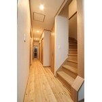 1Fはチェリー・2Fはホワイトアッシュ柄の床の廊下
