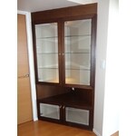 L型コーナーのスペースを有効活用できるように三角形のキュリオケースをご提案させて頂きました。ダウンライトとガラスの棚が飾る物を際立たせます。