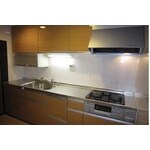 扉は上品な木目をお選び頂いたので、床も木目調の柄で揃え統一感を出しました。また「使いやすくしたい」とのご要望でしたので、吊戸棚の下には水切りを設置。食器などを洗った後、すぐ入れることができるので見た目もスッキリします。工事後、遊びに来られた友人にも大好評のご自慢のキッチンです。