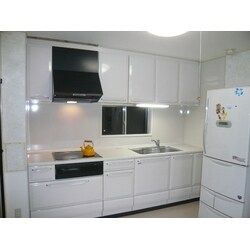 前のキッチンは、木目調のデザインでした。壁もタイル貼りでしたのでとてもお部屋が暗く感じていました。 今回のキッチンは、真っ白で周りがとても明るくなった感じがします。壁もキッチンパネルにしました。扉も鏡面ですので、お掃除がとても楽になりました。とても明るいキッチンになり家族皆楽しく食事をしております。