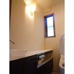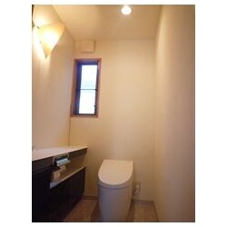 床はTOTOハイドロセラを使用。天井壁は珪藻土の仕上がりになっています。 レストルームドレッサーはオーダーメイドで間口にあわせてピッタリ納まりました。 またフラットなデザインのビルトインリモコンや室内暖房、洗浄機能、全て自動になっています。 既存の照明もバッチリ合っていますね!!