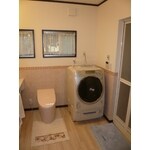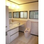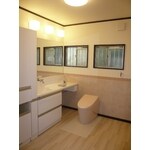 今まで別々だったトイレと脱衣場を一つにして広い空間を取りました。 化粧台には大きな鏡をつけて、さらに広い空間に見えるように工夫しました。 奥様のイメージによく合った雰囲気の内装で大変かわいらしく仕上がりました。