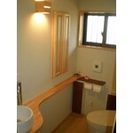 ○寒々しい雰囲気と湿気のあるトイレをなんとかしたい ○便器がこわれてしまったため直したい。 とご相談を頂きました。 壁、天井は珪藻土、床は竹で仕上げ、自然素材のゆったりとした空間で落ち着ける空間になりました。手すり兼用のカウンターを付け、将来的にも安心な設計にしました。 構造上、普通のお宅より天井が低かったのですが、照明を横付にしたり、物があふれないようパインの埋込収納を取付けるなど、圧迫感を感じさせない工夫をしました。