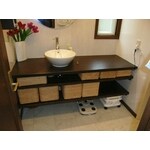 既製品の組み合わせでもご提案しましたが、今回は洗面ボウルや水栓金具など、お好みの部材を組み合わせた、カウンター式の洗面プランをおすすめしました。カウンターや棚板など、シンプルに配置し、後からお客様にお好みの小物でアレンジしていただけます。