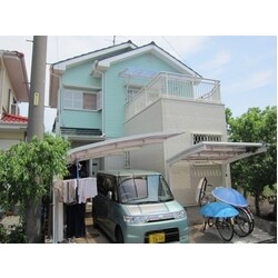 お施主様のご要望により、愛車と色を合わせたさわやかなミントブルー系の色に仕上がりました。2階バルコニーのテラスもアイスブルーに変更し全体の統一感が増しています。