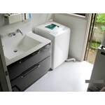 ボイラーはまだ年式が新しかったので既存の物をそのまま使うことにしましたが、給湯配管にサビが出てきたので、この機会にお風呂以外の部分の配管も床下にもぐって交換することにしました。タカラさんでのイベントにご来場いただき、システムバスはステップ付き人造大理石浴室のルーノを選択。カラーを合わせた洗面化粧台アルファージュと合わせて、ハイセンスな水廻り空間を演出しています。