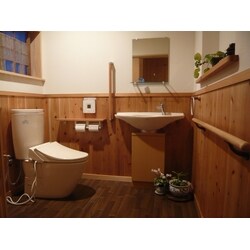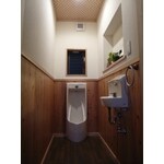お客様のご希望で、ナチュラルモダンをテーマにトイレのリフォームをさせていただきました。木のぬくもりを感じる壁材は、明るめのものをチョイスし、より温かみのある空間を実現。紙巻器や手すり、タオル掛けなどの小物も木質系で統一しました。手洗器は幅の広いタイプのもので、指先だけでなく、手全体をしっかり洗うことができます。壁には小物を飾るスペースもつくり、インテリアもお楽しみいただけるオシャレなトイレに仕上がりました。