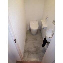 某芸能事務所のトイレ改修物件。もともと古い和風トイレを最先端のタンクレス節水トイレに大変身 壁は塗り壁で床はコンクリート打ち放しにクリアー塗装仕上げで、浸み込まない工夫を施しています。