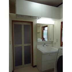 家族が多いため、収納の少ない洗面室でお困りでした。 今回は吊戸棚(プルダウン式)や引き出し収納の洗面化粧台をご提案させて頂きました。 また、トイレのクロスも張り替えて、明るい水周りになりました。